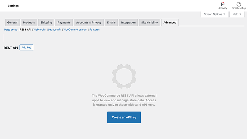 2. Successively click on 'Advanced' (top tabs), 'REST API' (line below tabs) and 'Create an API key' (big button on page)