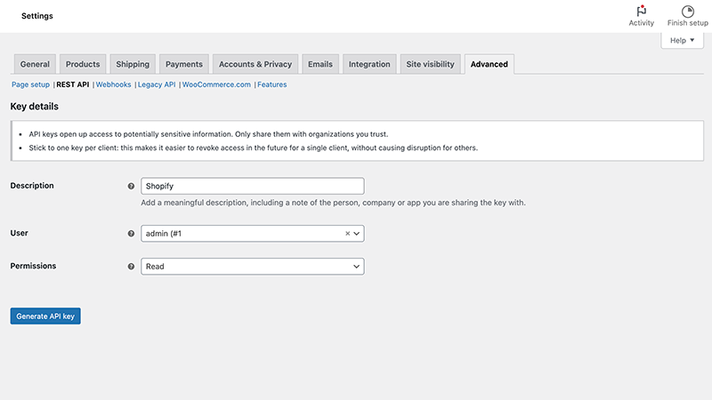 3. Enter 'Shopify' in the 'Description' field, set the 'Permissions' to 'Read' and click 'Generate API key'