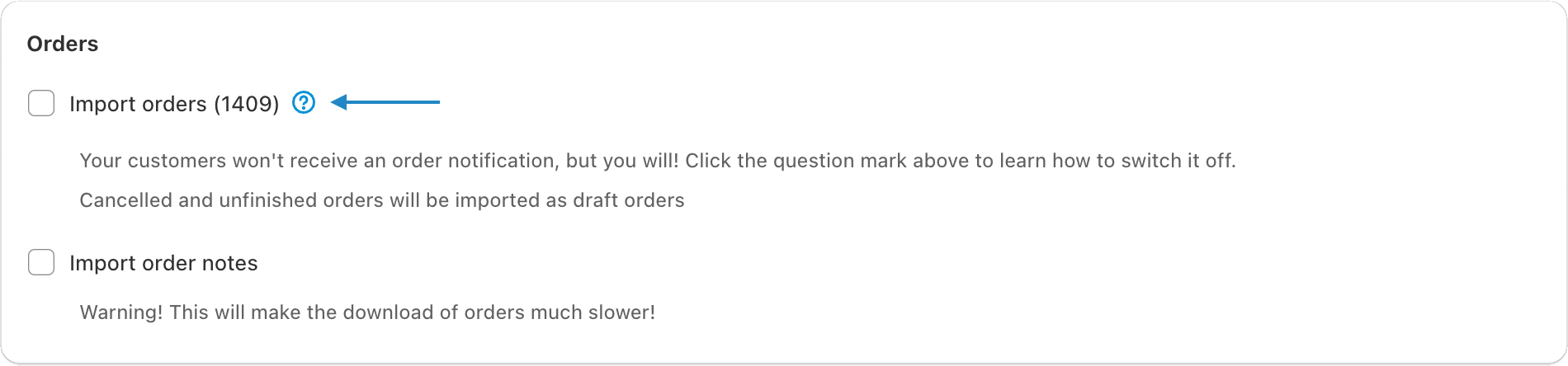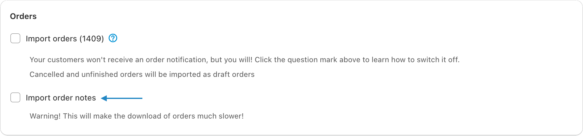 Store Importer allows you to migrate your WooCommerce order notes to Shopify, but it's important to know that this will slow down the process a lot! If you still need your order notes after reading this warning, you can select the option as pointed out below: